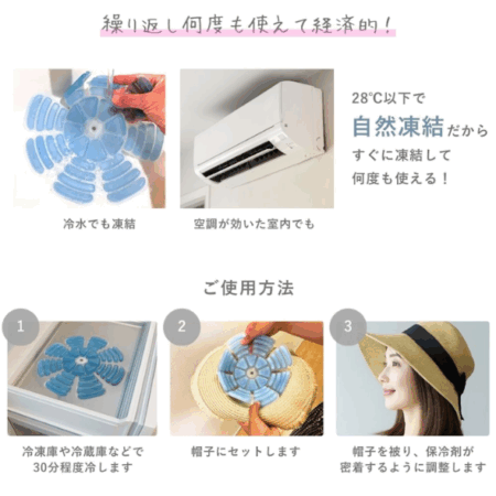 帽子、ヘルメットに入れるだけで簡単に熱中症対策ができる帽子用保冷剤です。 PCM素材の為繰り返し使用ができ短時間の冷却で冷たさを持続させることができ 薄型タイプ 持続時間約40分 厚型タイプ 持続時間約90分 キッズタイプ 持続時間約60分 の3種類から選ぶことができます。 帽子用保冷剤のお問合せ、お見積り依頼、ご注文はこちらから キャッチクールMCH 前の記事 エアコン室外機カバー 次の記事